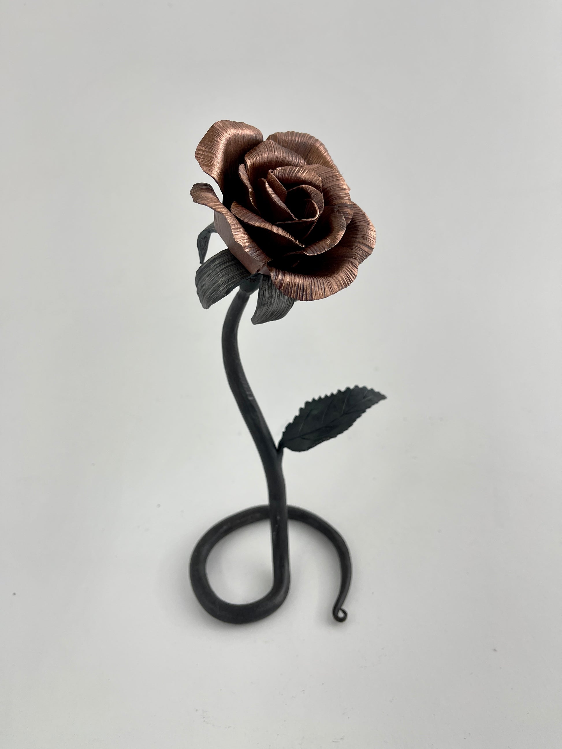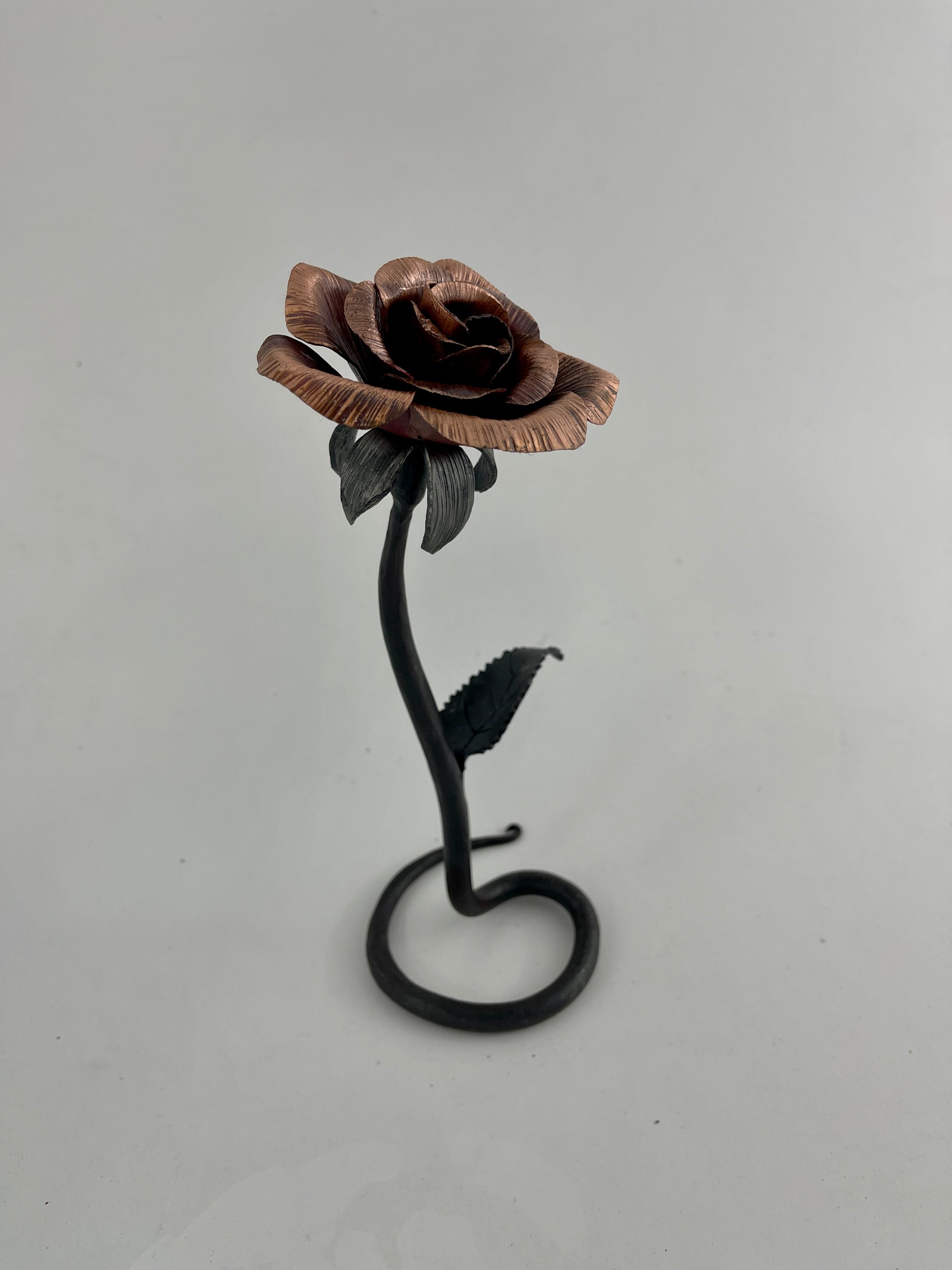 Copper and steel rose with scrolled base